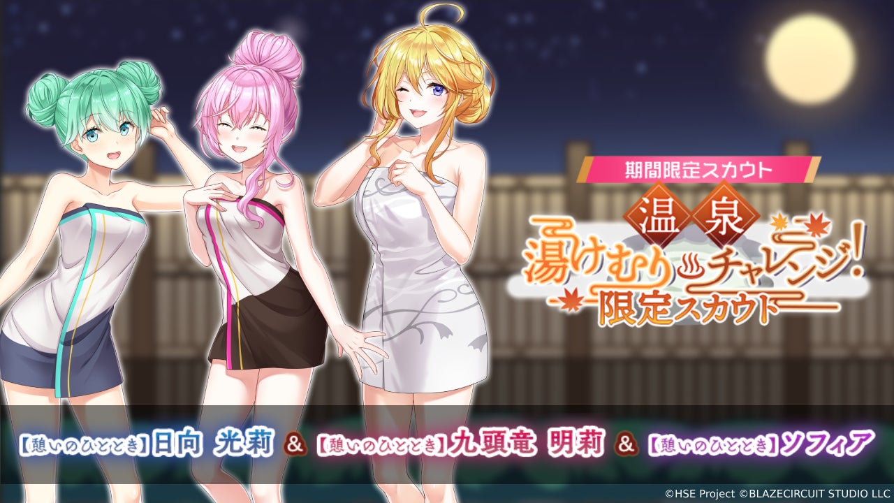 限定スカウト【温泉湯けむりチャレンジ!】も開催中!【憩いのひととき】日向 光莉、【憩いのひととき】九頭竜 明莉、【憩いのひととき】ソフィア・B・時任をはじめ、11月から12月中旬にかけて温泉衣装のキャラクターが続々と登場します!ぜひゲットしてください。