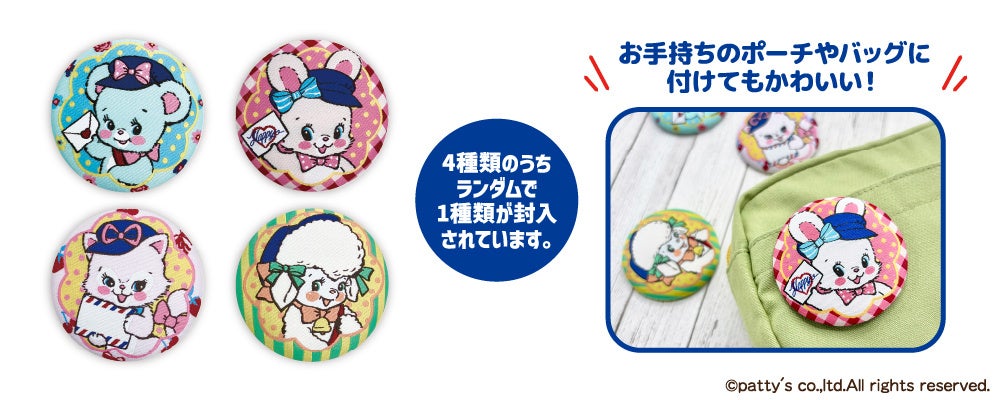 全4種類のうち何が当たるかはお楽しみのジャガード織缶バッジ。お手持ちのポーチやバッグに付けてもかわいい!郵便局のネットショップ限定で、必ず4種類が揃うコンプリートセットも数量限定で販売します。