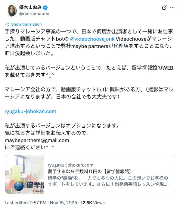 私も出演できるので、ブランディングと成果改善を両立したい企業さまはぜひご相談ください。撮影はマレーシアでも、日本企業にも導入できます。」