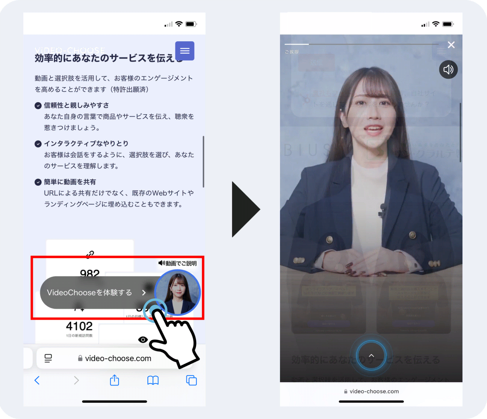 「VideoChoose」は、国内初※1の 動画版チャットボット であり、デジタルマーケティングに革新をもたらすソリューションです。これをウェブサイトや広告LPに設置することで、訪問者の関心を惹きつけ、情報を直感的かつ効果的に伝え、最適なアクションへと導きます。