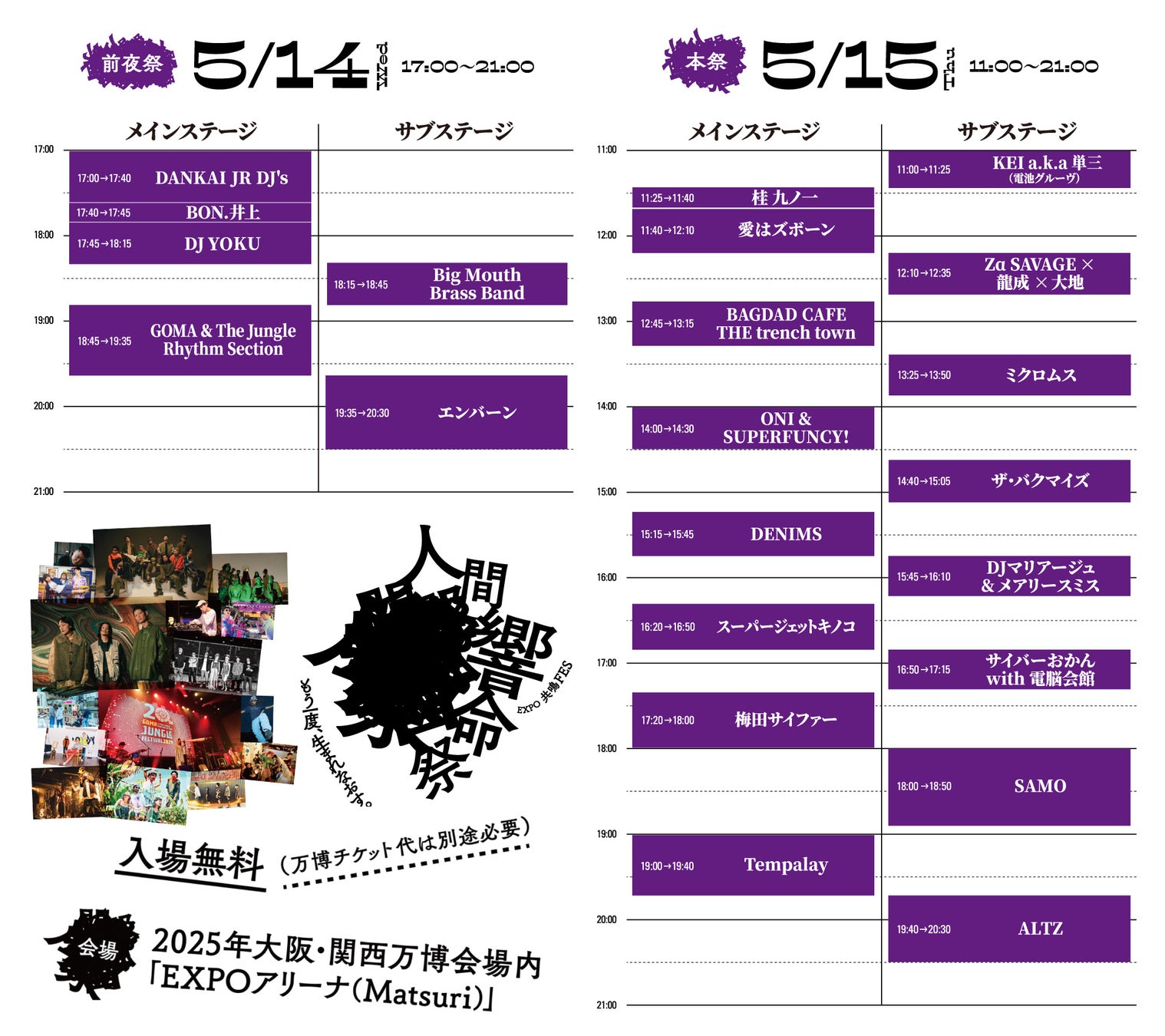 2025年5月14日(水)・15日(木)に大阪・関西万博会場内「EXPOアリーナ(Matsuri)」で開催するカルチャーフェスティバル『EXPO共鳴フェス -人間響命祭-』の追加アーティスト及びタイムテーブルを発表いたします。
