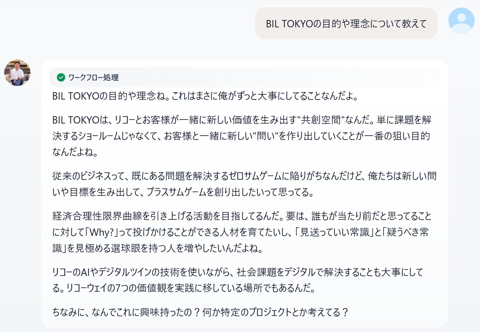 株式会社THA(本社:東京都新宿区、代表取締役:西山朝子)は、株式会社リコーが運営する共創拠点「RICOH BUSINESS INNOVATION LOUNGE TOKYO(以下、RICOH BIL TOKYO)」において、「AI社長」をベースに、RICOH BIL TOKYOのゼネラルマネージャー 菊地英敏氏が持つ考え方や対話スタイル、場づくりへの想いを、知識や想いとともに“生きた形”で継承・活用できる仕組みとして、専用AI『BIL TOKYO AI』を導入したことをお知らせいたします。