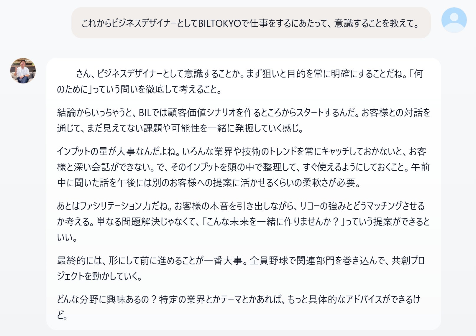 「BIL TOKYO AI」の会話例