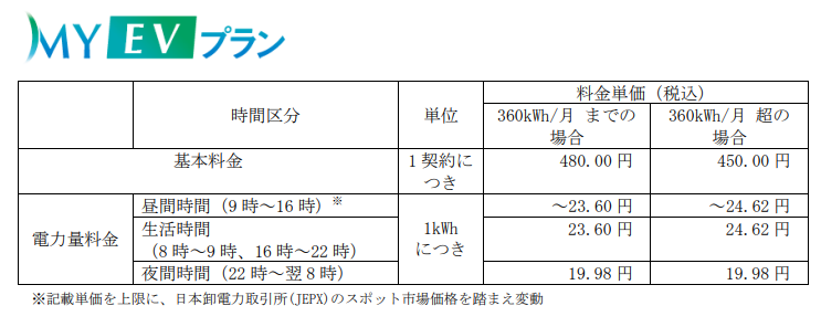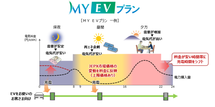 EVをお使いのお客さま向け※4の電気料金メニュー「MY EVプラン」は、通年で夜間の単価を安くすることで、お客さまのEVの充電コストを低減します。また、昼間の一部時間では日本卸電力取引所(JEPX)の市場価格の変動を料金単価(上限あり)に反映することで割安とします。