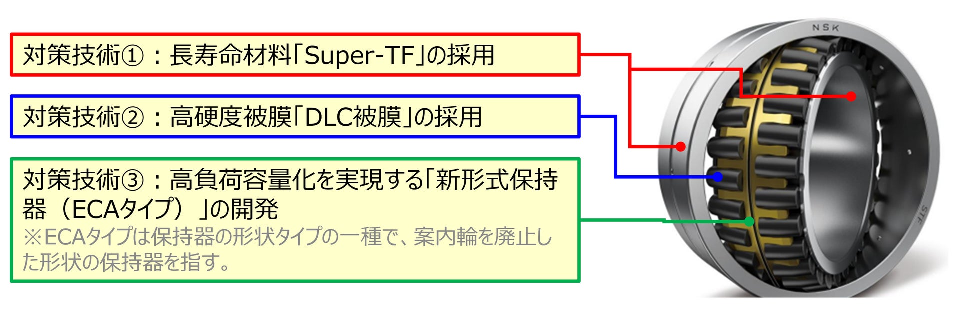 ●今回、「高負荷容量化を実現する新形式保持器」を新開発し、既存の2つの対策技術と組み合わせた。3つの対策技術を適用した製品は、NSK初。