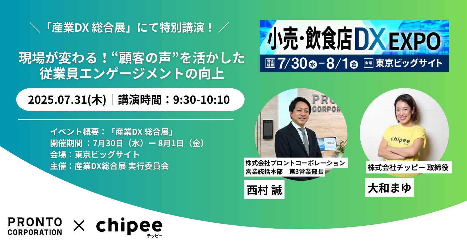 「こころとこころをつなぎ、世界を思いやりで満たす」をパーパスに掲げ、ウェルビーイング経営の実現を支援する株式会社チッピー(本社:東京都渋谷区、代表取締役:山崎令二郎、以下「チッピー」)は、2025年7月30日(水)〜8月1日(金)に東京ビッグサイトで開催される「産業DX総合展」に参加。同展示会内の「小売・飲食店DX EXPO」にて、7月31日(木)に特別講演を行います。