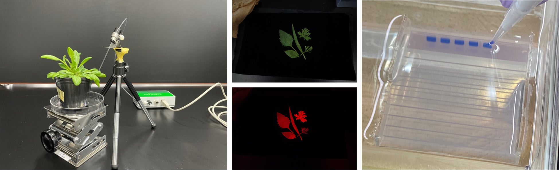 植物の葉は光合成を行っています。光合成に光が必要であることはよく知られていますが、強すぎる光はかえって植物を傷つけてしまいます。本プログラムでは、①「クロロフィル抽出とクロロフィル蛍光の確認」、②「クロロフィル蛍光測定器を使った光合成活性測定」、③「DNAの制限酵素処理と電気泳動」の3つの実験により、光を吸収する色素(クロロフィル)が発する蛍光を実際に目で見て、測定し、そして光合成がどのように行われているのかを受講生が体感します。除草剤による光合成の阻害、除草剤耐性植物のDNA解析についても実験を通して観察し、教科書の学びとは違った科学の面白さについて、身をもって経験できる機会となります。