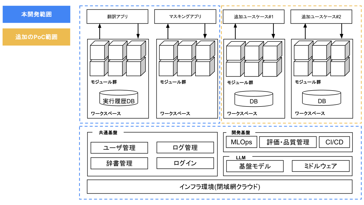 本プロジェクトは、2025年7月に発表したPoC(プレスリリースはこちら)を経て、クラウド閉域網環境における共通基盤の開発、および「翻訳・マスキング」機能の実装を完了しました。また、さらなる実用性を追求するため、「業務文書自動作成」と「稟議書レビュー」に関する追加検証を現在試行中です。