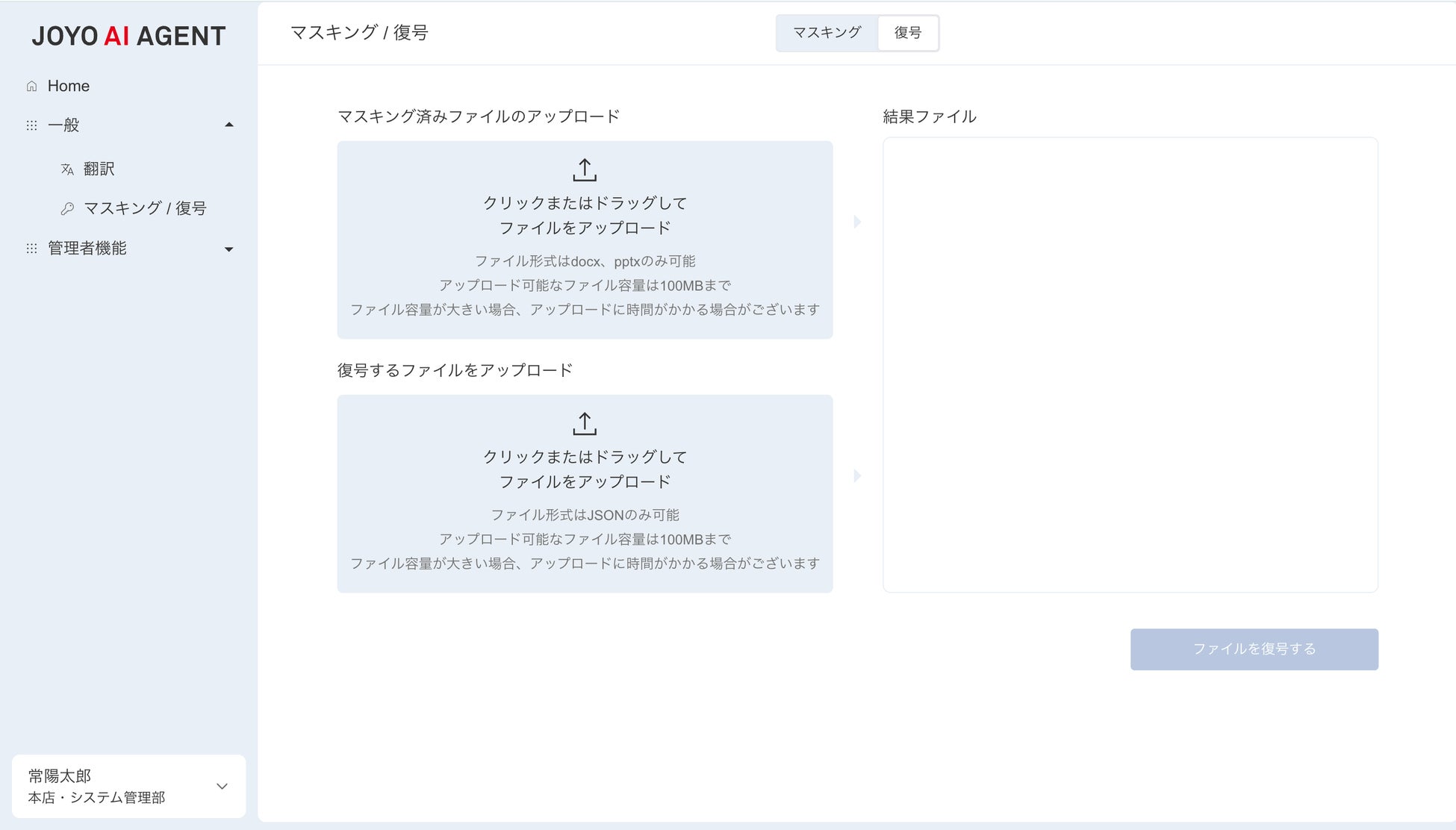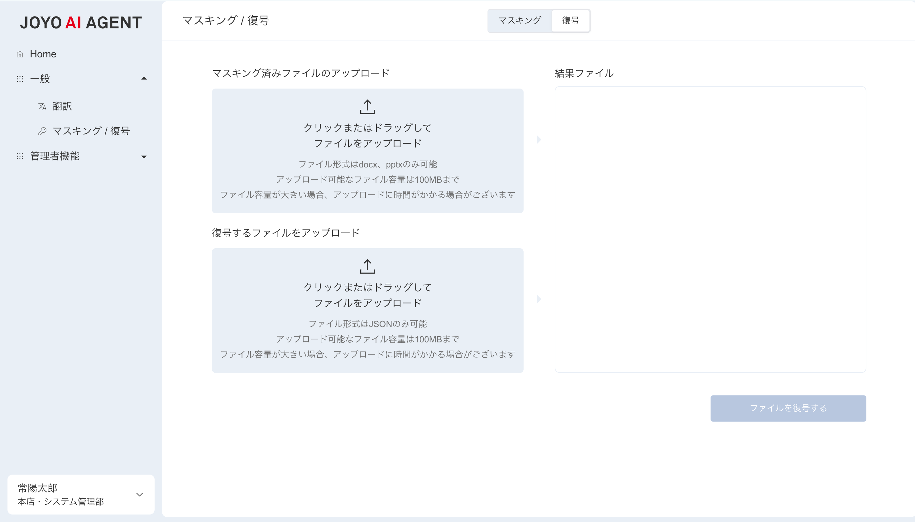 対象ファイルをアップロードしてボタンをクリックするだけで処理が実行される「プロンプトレスUI」を採用しました。これにより、専門的な知識の有無にかかわらず、全ての行員が「JOYO AI AGENT」を使いこなせる環境を提供します。