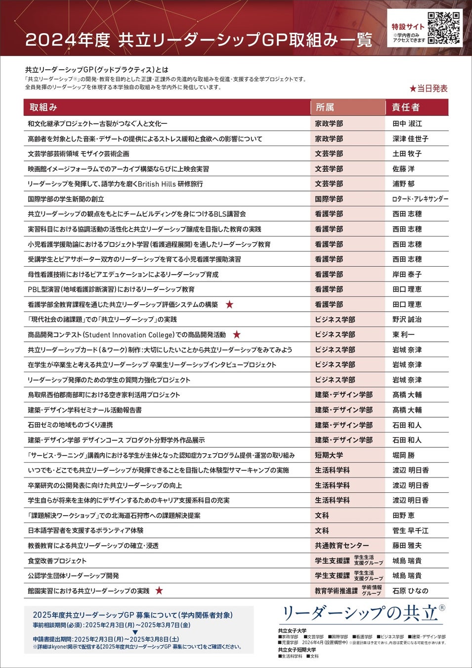 本学では、『みずからを恃(たの)み「自立」し、「友愛」により他者と協働して目標達成を目指す力』を「共立リーダーシップ」と定義しています。「21世紀型リーダーシップ」「世界標準のリーダーシップ」に基づき、体系だった教育プログラムを展開する中、2024年度には、リーダーシップ教育を促進・支援するための全学プロジェクト「共立リーダーシップGP」を開始し、30を超える取組みを実施しました。