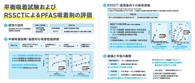 浄水処理におけるPFAS(PFOS、PFOA)用吸着剤3種類(鉱物系吸着剤、イオン交換樹脂、粒状活性炭)の性能を基礎的な吸着性能を見る平衡吸着試験と、実用条件での寿命を評価するRSSCT試験(Rapid Small-Scale Column Test)によって評価いたしました。基礎吸着能力はイオン交換樹脂が最も高く、一方RSSCTでは、PFAS以外の様々な物質が共存する実際の水質において鉱物系吸着剤が最も寿命が長いという結果となりました。これは鉱物系吸着剤が共存物質の影響を受けにくいためと考えられています。
