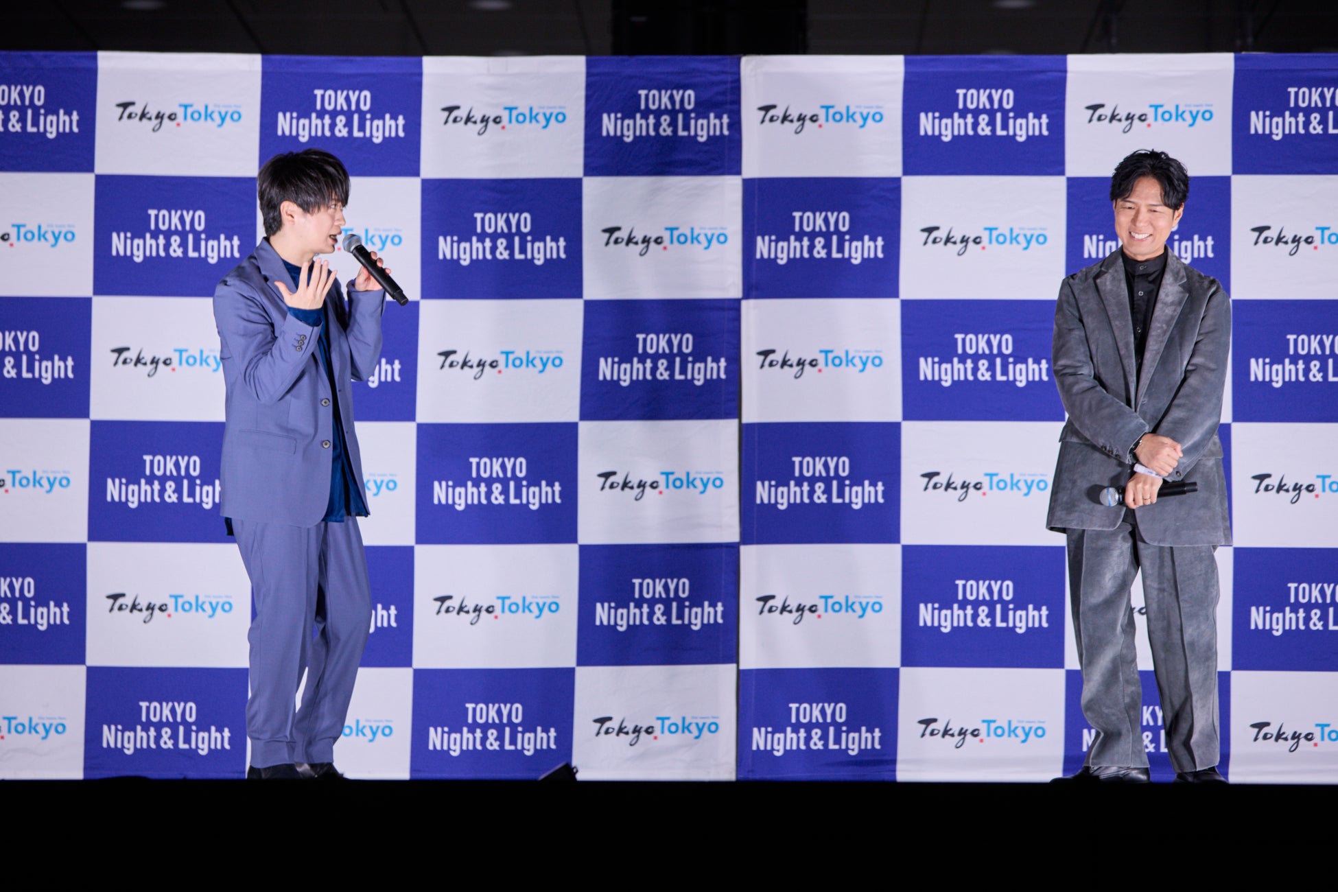 上映初日イベントには、声優の浦 和希さん(潔 世一役)、神谷 浩史さん(絵心 甚八役)のお二方に登壇頂き、トークセッションと初回上映のカウントダウンを実施。お二方の掛け声で上映がスタートし、会場は大いに盛り上がりました。プロジェクションマッピングを見た感想として浦さんは「圧巻の一言!ブルーロックの魅力がプロジェクションマッピングならではの大迫力な映像で表現されていました。思い入れの強い作品が巨大な都庁に映し出される様子に、感慨深い気持ちになりました。」とコメント。また神谷さんはファンに向けて「一度では描かれるすべてを見きれない巨大な映像なので、是非何度も見てください!ブルーロック関連初のイベント出演が都庁の仕事で光栄でした。これからも応援よろしくお願いいたします!」とメッセージを送りました。