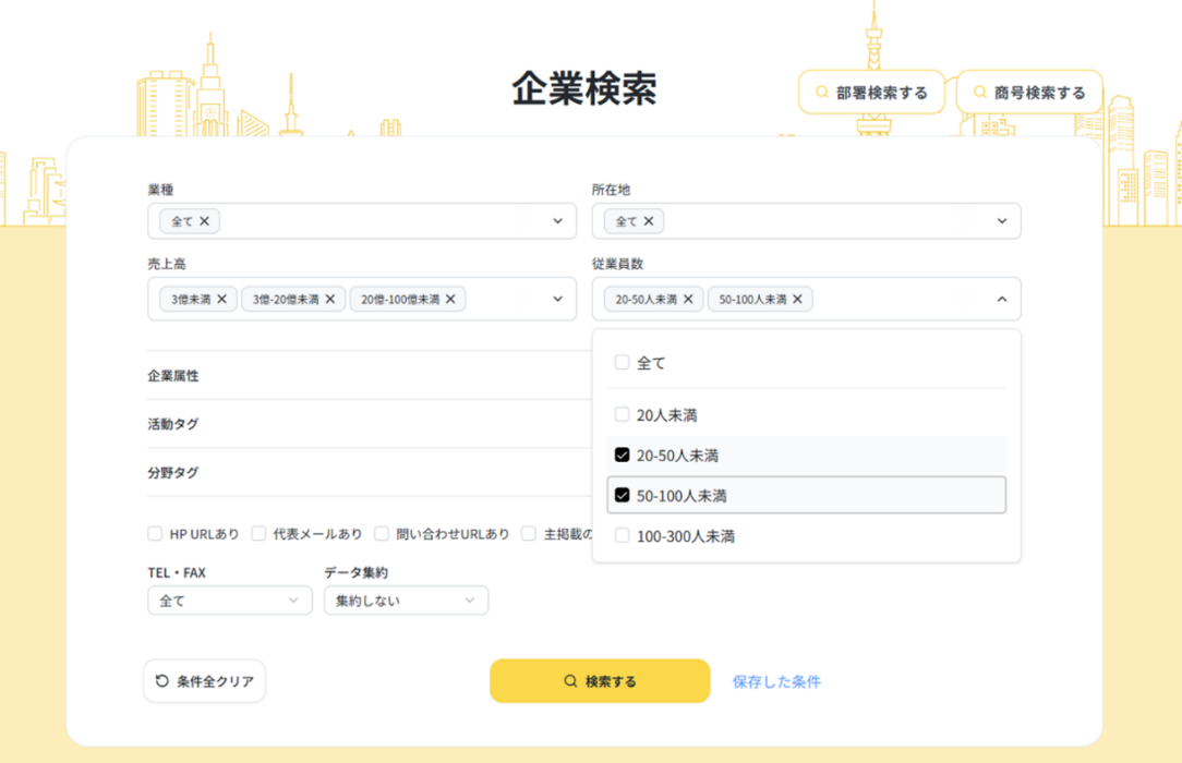 シンプルで直感的な操作性を備えており、簡単なクリック操作で検索条件の選択ができ、検索後のリスト出力もスムーズに行えます。営業リスト化やマーケティングへの活用まで業務の効率化を支援いたします。