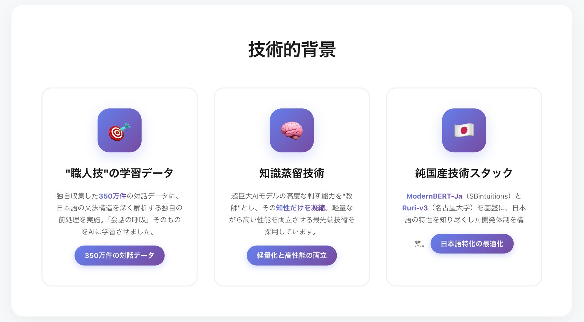 350万件の"職人技"学習データ: 独自に収集した膨大な対話データに対し、日本語の文法構造を深く解析する独自の前処理を実施。「会話の呼吸」そのものをAIに学習させました。