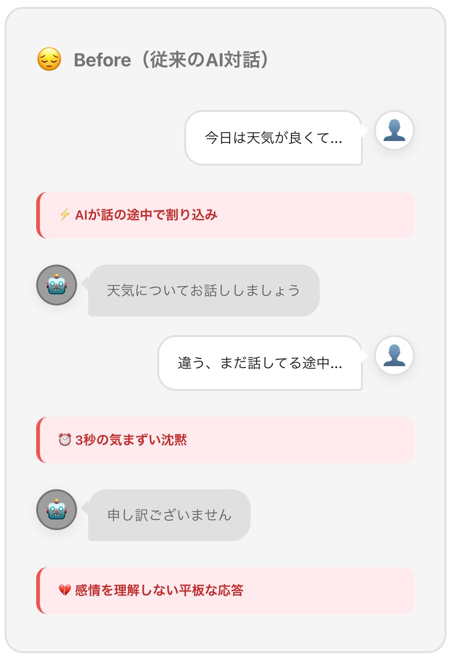 従来は「どこで会話が一区切りしたか」をAIが正確に判断できず、会話に割り込んだり応答が遅れたりする問題がありました。またテキストに込められた「喜び」や「悲しみ」といった感情の細やかなニュアンスを汲み取れず、平板な応答しかできないという課題も存在しました。