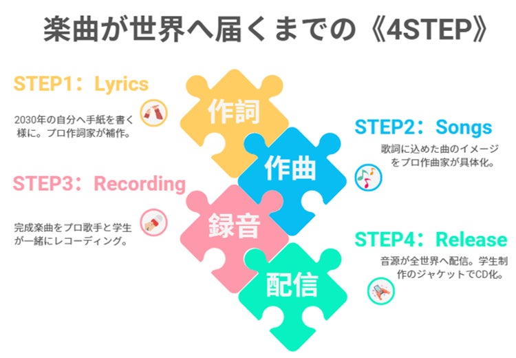本プロジェクトの楽曲は【作詞→作曲→録音】の流れで制作され、その後世界に向けて配信されますが、各工程において各分野のプロフェッショナルを起用し、この共創プログラムに参加していただきます。作詞工程においては、子どもたちが作成した歌詞を、作詞家/シンガーソングライターが補作し、作曲工程においては、子どもたちが歌詞に込めた想いを、作曲家が作曲〜音源制作を行います。また、録音工程においては人気声優がメインボーカルを務め、その作品のクオリティを高めます。子どもたちがプロの技術を肌で感じる機会が度々訪れる、世界に類を見ない国際共創教育プロジェクトと言えるでしょう。