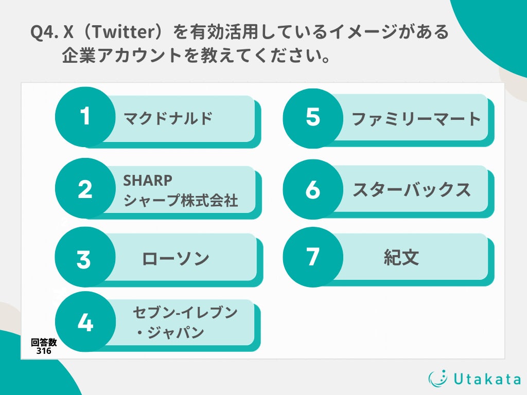 「X(Twitter)を有効活用しているイメージがある企業アカウントを教えてください。」と質問したところ、「マクドナルド」が28票、「SHARP」が24票、「ローソン」が21票、「セブン-イレブン・ジャパン」が9票という回答となりました。