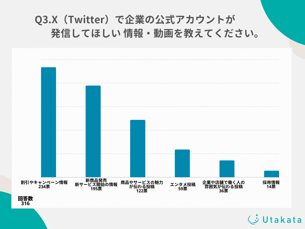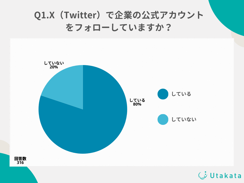 ショート動画SNSの運用やインフルエンサーキャスティングを行う株式会社Utakata(https://utakata.co.jp/)は、X(Twitter)の10代〜50代の男女316名を対象に、「Xの企業アカウント」に関する調査を実施いたしましたのでお知らせいたします。