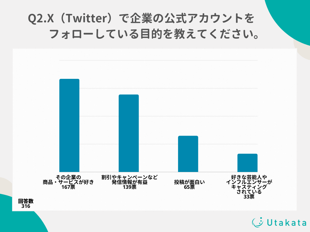 「X(Twitter)で企業の公式アカウントをフォローしている目的を教えてください。」と質問したところ、「その企業の商品・サービスが好き」が167票、「割引やキャンペーンなど発信情報が有益」が139票、「投稿が面白い」が65票、「好きな芸能人やインフルエンサーがキャスティングされている」が33票という回答となりました。