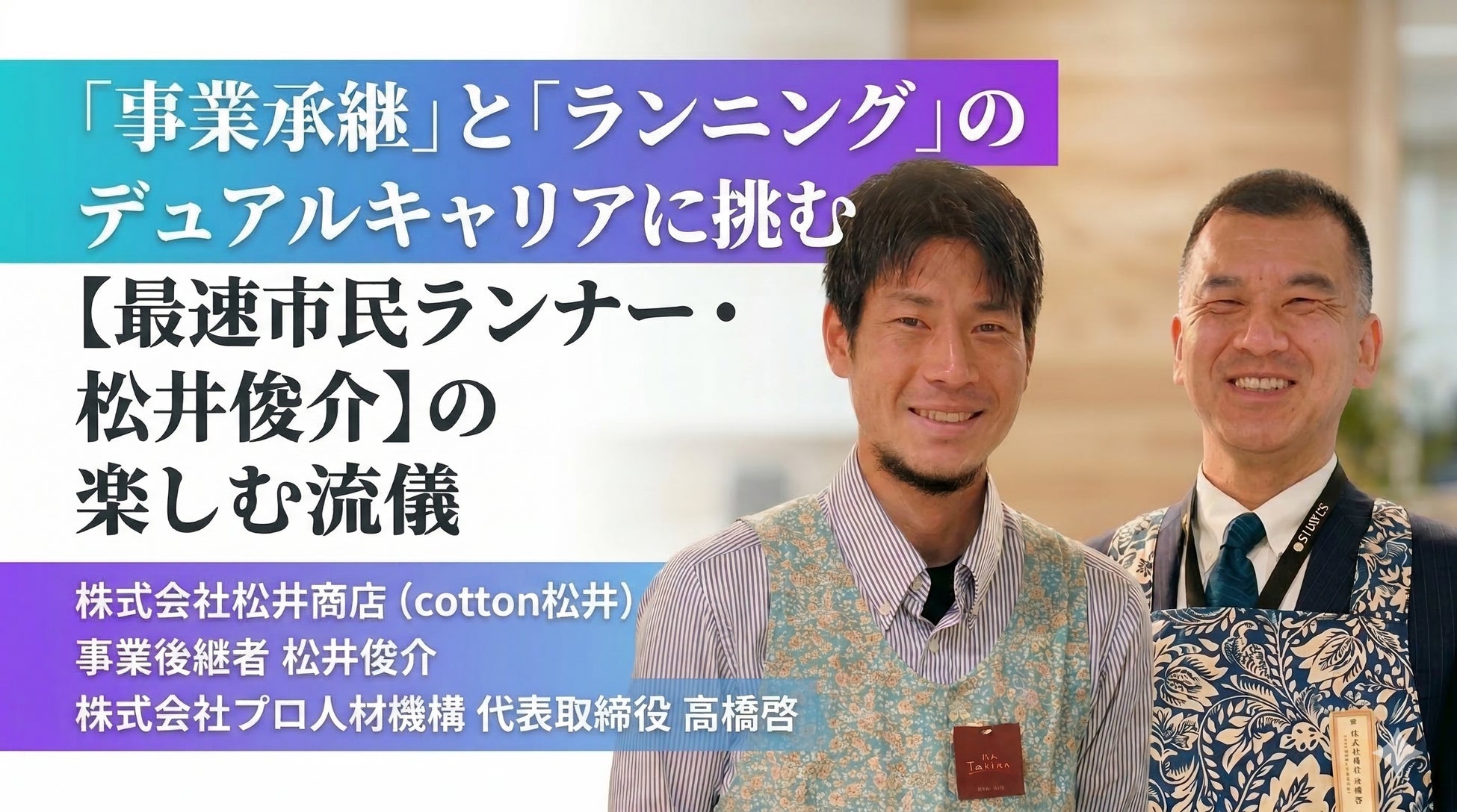 プロ経営人材の紹介を通じて地方事業承継を支援する株式会社プロ人材機構(本社:東京都千代田区、代表取締役:高橋 啓、以下「当社」)は、家業の取締役としてフルタイムで働く傍ら国内トップクラスの記録を持つ「進撃の通勤ランナー」こと松井俊介選手とスポンサード契約を締結したことをお知らせいたします。