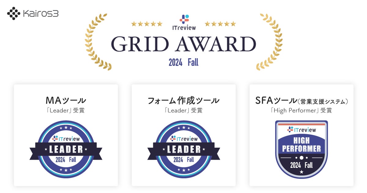 カイロスマーケティング株式会社(本社:東京都渋谷区、代表取締役:佐宗 大介、以下「当社」)が提供する、売上アップを仕組みで実現するCRM「Kairos3(カイロススリー)」は、「ITreview Grid Award 2024 Fall」において、2部門にて「Leader」、1部門にて「High Performer」を受賞したことをお知らせいたします。