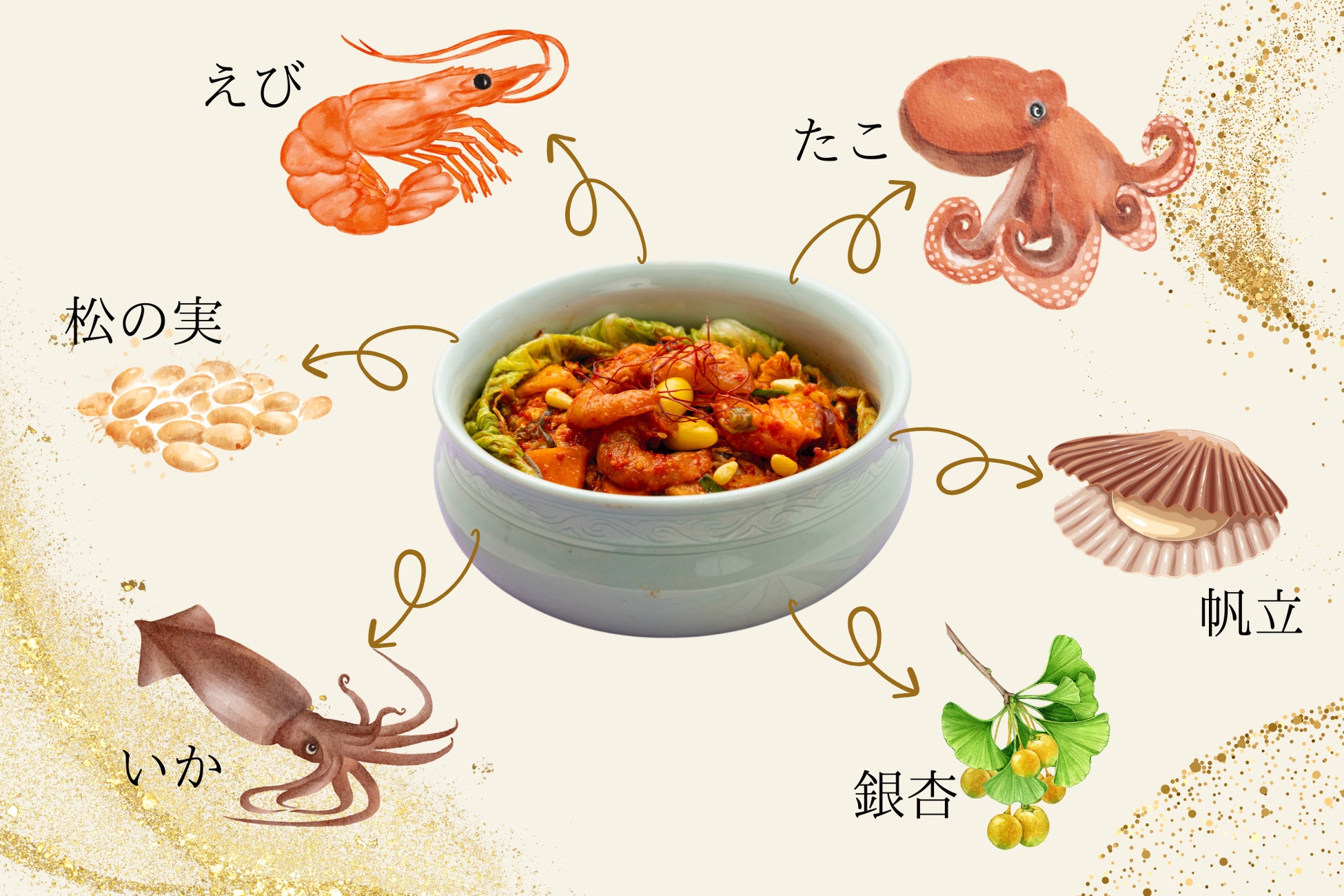 魚介類をたくさん包んだ贅沢なキムチは「キムチの王様」とも言われる豪華な逸品です。