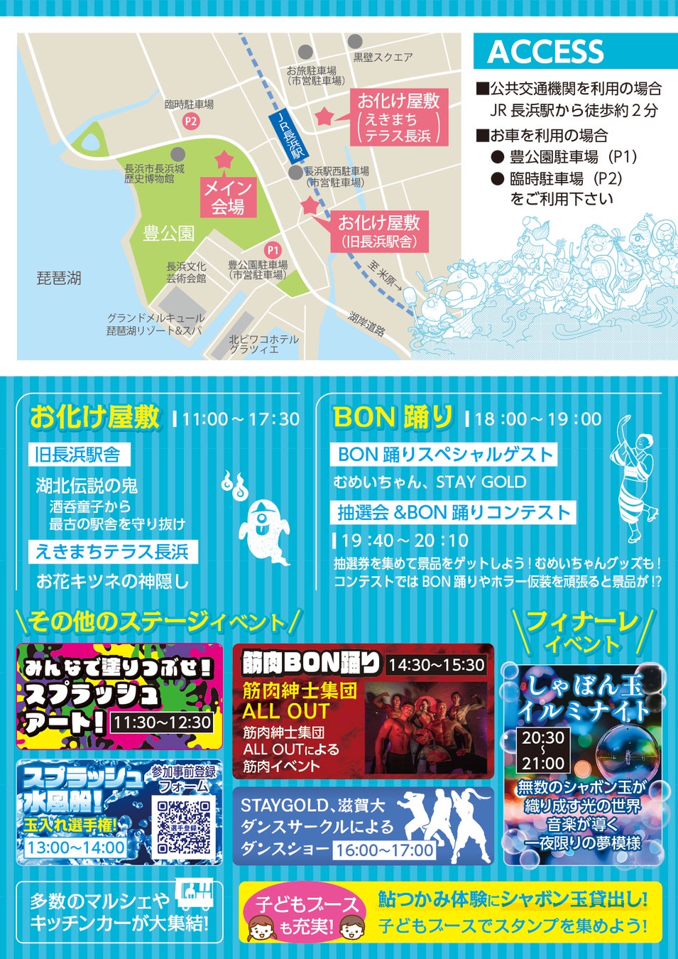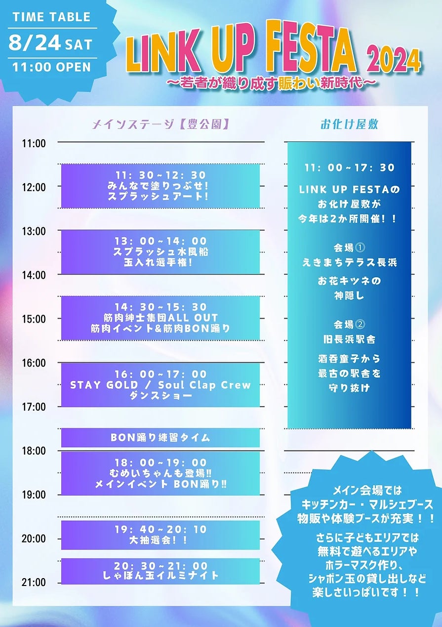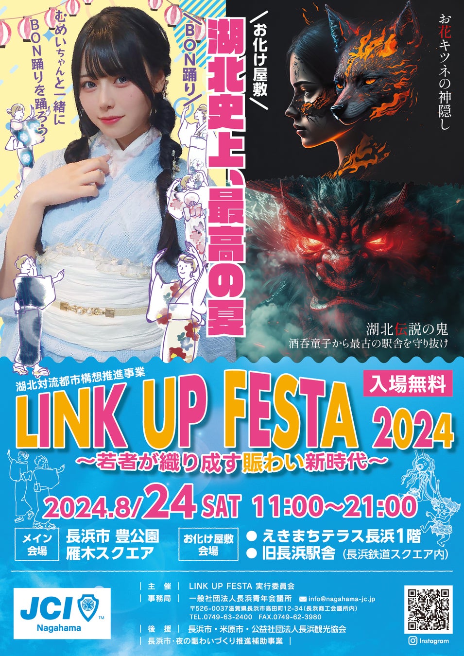 今年で3年目を迎えるLINK UP FESTAは大きくバージョンアップ、二大メインコンテンツの一つである「お化け屋敷」では日本最古の駅舎である文化財・旧長浜駅舎と地元の伝記を掛け合わせたホラーを提供、もう一つのメインコンテンツ「BON踊り」ではSNS総フォロワー数500万人を超えるインフルエンサー「むめいちゃん」と共に踊り地域に賑わいをもたらします★
