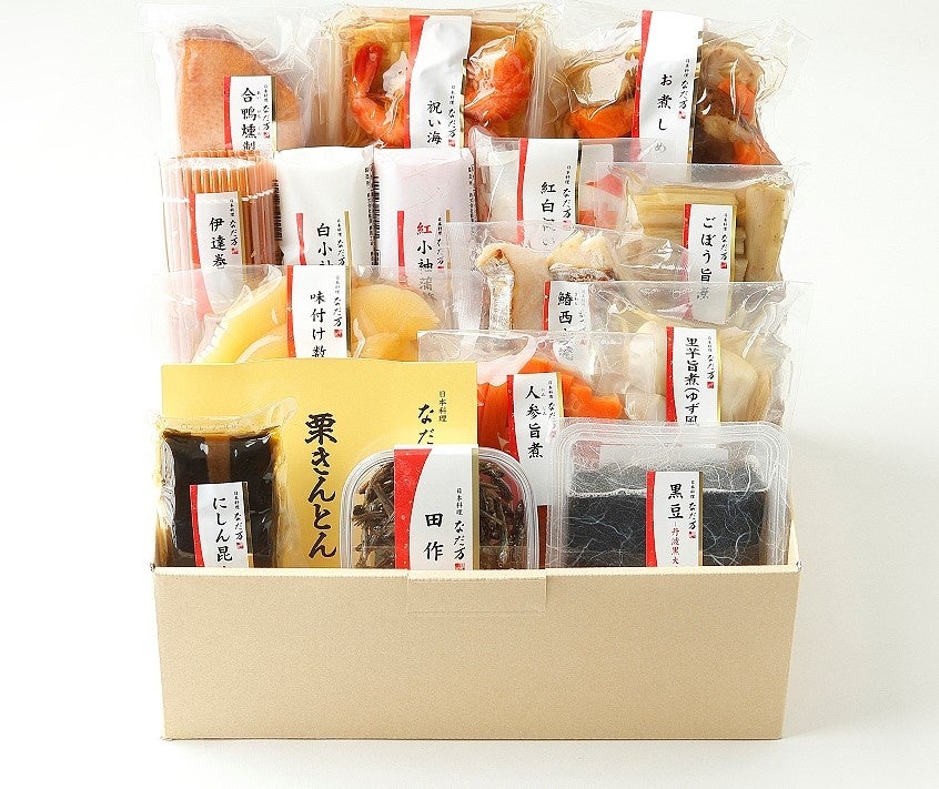 それぞれの食材が、調理済みの状態で個包装になっています。ご家庭にある重箱やお皿に盛り付けていただくだけでおせち料理が楽しめる、なだ万の“単品おせち”を詰め合せた商品です。黒豆・伊達巻・数の子はもちろん、蒲鉾や田作りといったおせち料理が揃っています。