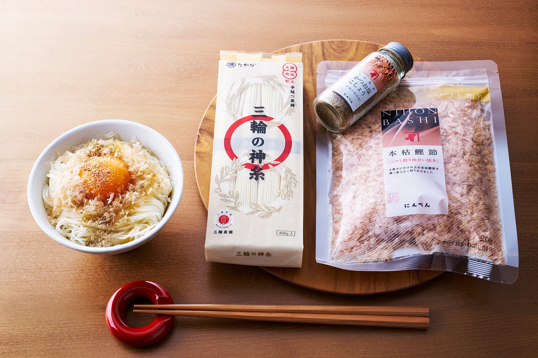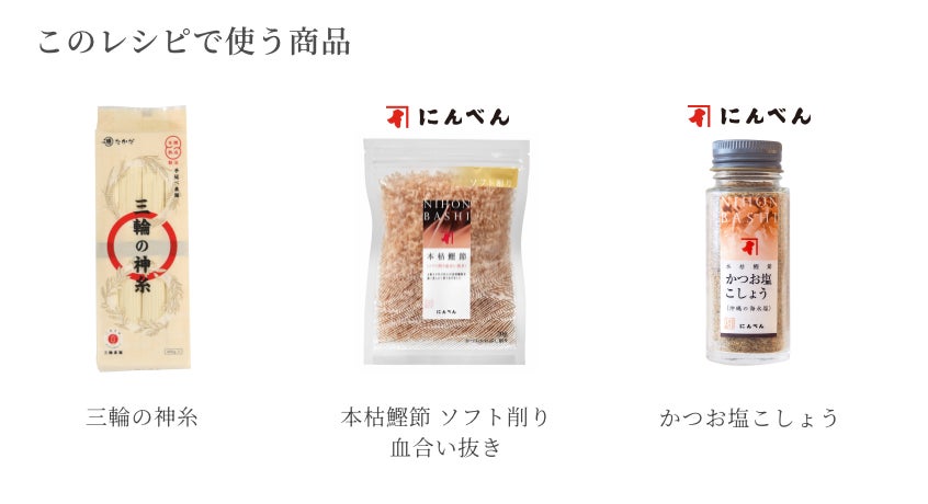 「ローリングストック」は、いつも食べている食品を少し多めに買い置きしておくことから始まります。ストック食材を食べ慣れするには、おいしく食べる日常のレシピアイデアの備えも大切です。三輪の神糸は、フランスパンの材料としても使用される準強力粉を原料に製麺されてるため、上質な素麺の小麦の香りを楽しめます。にんべんの血合い部を取り除いた本枯鰹節は生臭さがなく風味が豊かな逸品!