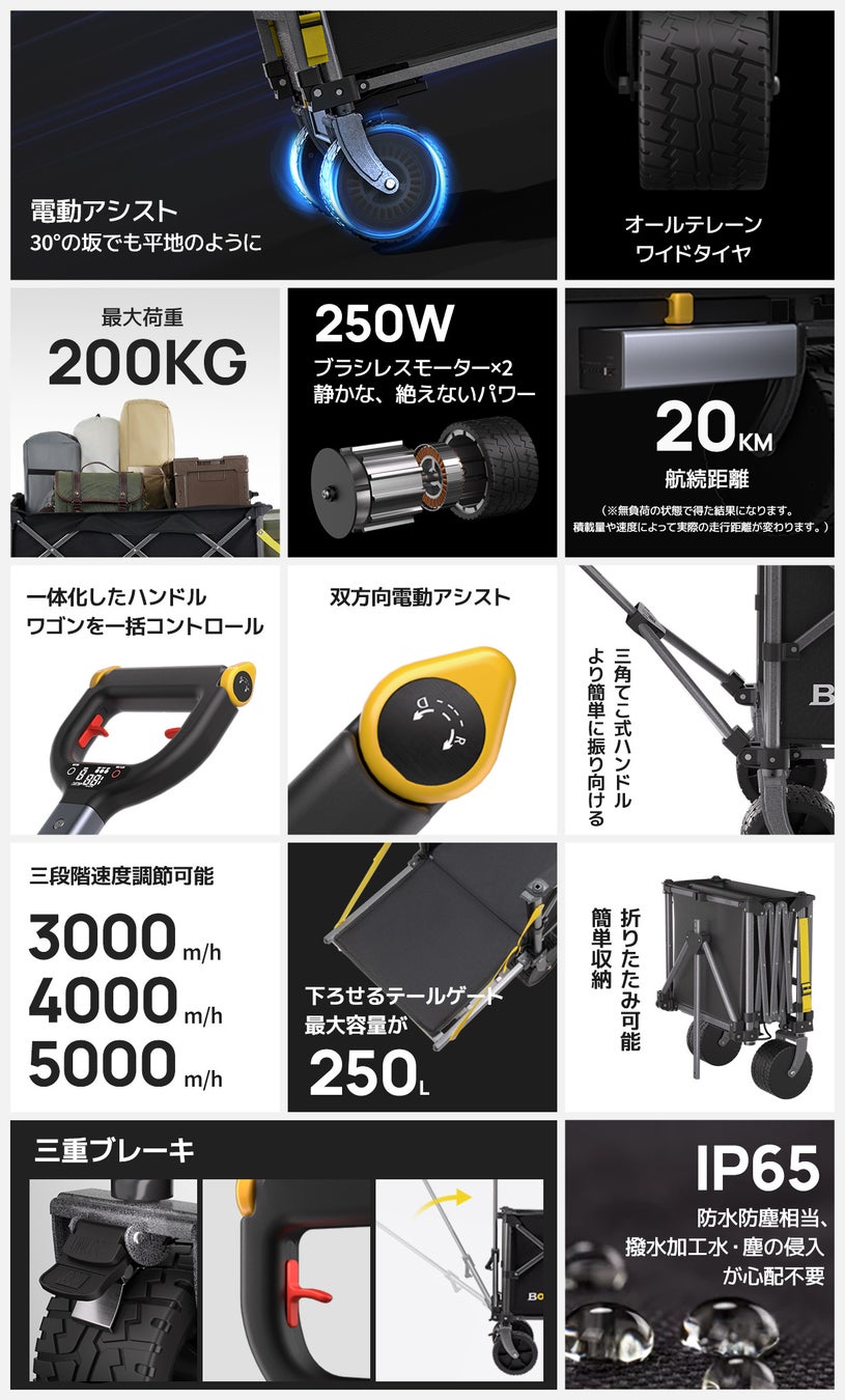 従来のキャリーワゴンは、重い荷物を運ぶ際に多くの力が必要で、操作が難しいという問題がありました。しかし、「BougeRV 楽GoWagon」は電動駆動を採用することで、手動ワゴンに比べて大幅に利便性が向上しています。