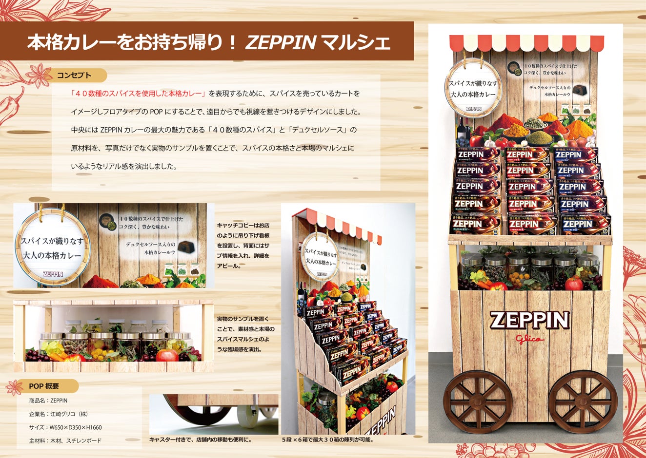 伝統的なマルシェワゴンを活かした「ZEPPIN」カレー売り場のディスプレイは、ボリューム陳列と40種スパイスの現物展示で説得力のある演出に成功。スパイスに囲まれたワゴンは来店者の関心を引き、触れたくなる魅力を生んでいる。さらに次世代型の売り場提案があればより良かった。