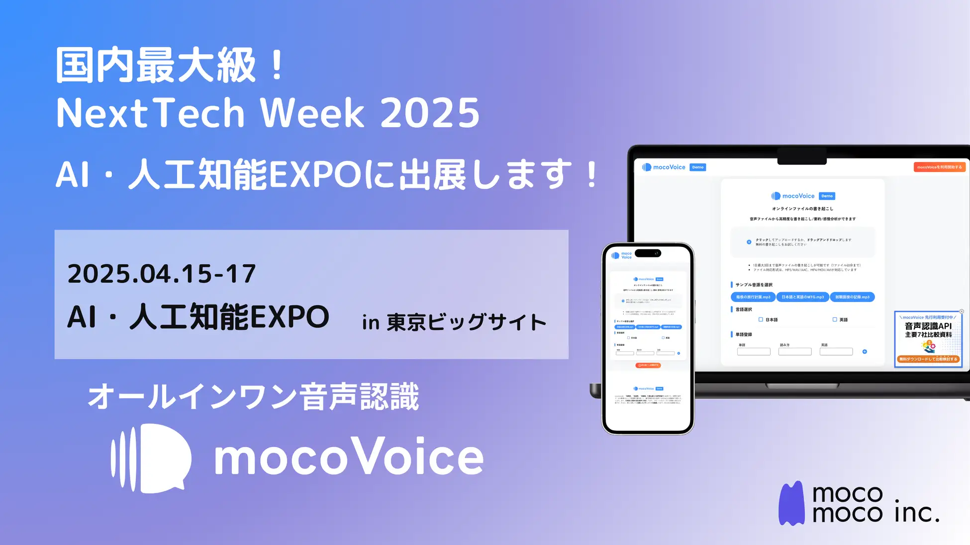 高性能音声認識AI「mocoVoice」を提供するmocomoco株式会社は、2025年4月15日(火)~17日(木)の3日間、東京ビッグサイト東展示棟第7ホールにて開催されるエキシビジョン「NextTech Week 2025 AI・人工知能EXPO」に出展いたします。