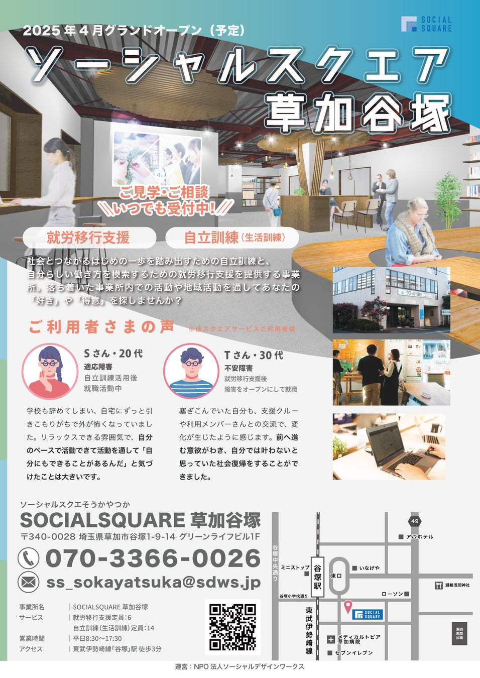 NPO法人ソーシャルデザインワークス(代表理事:北山剛)では、SOCIALSQUARE草加谷塚店のオープンに先立ち、ご利用をご検討の皆様、また福祉事業者様等を対象に、無料説明会を市内各所で開催いたします。説明会後半はスタッフによる個別相談も実施します。