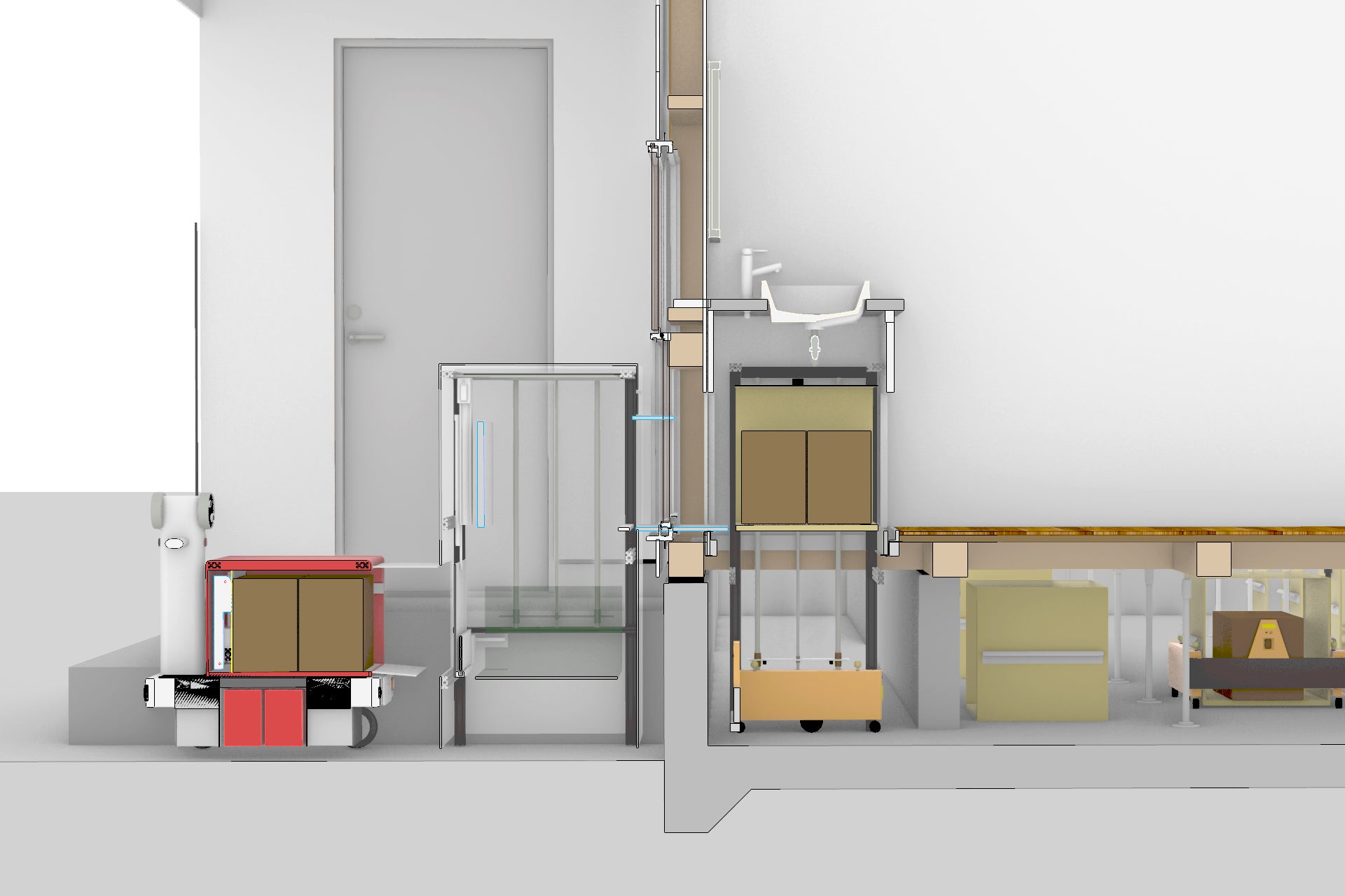 床下を収納として活用するロボット床下収納では、荷物の出し入れを簡単に行うために床下エレベーターを用います。「洗面台組込式床下エレベーター」は、その床下エレベーターを洗面台のキャビネットにビルトインしたA種デバイスです。