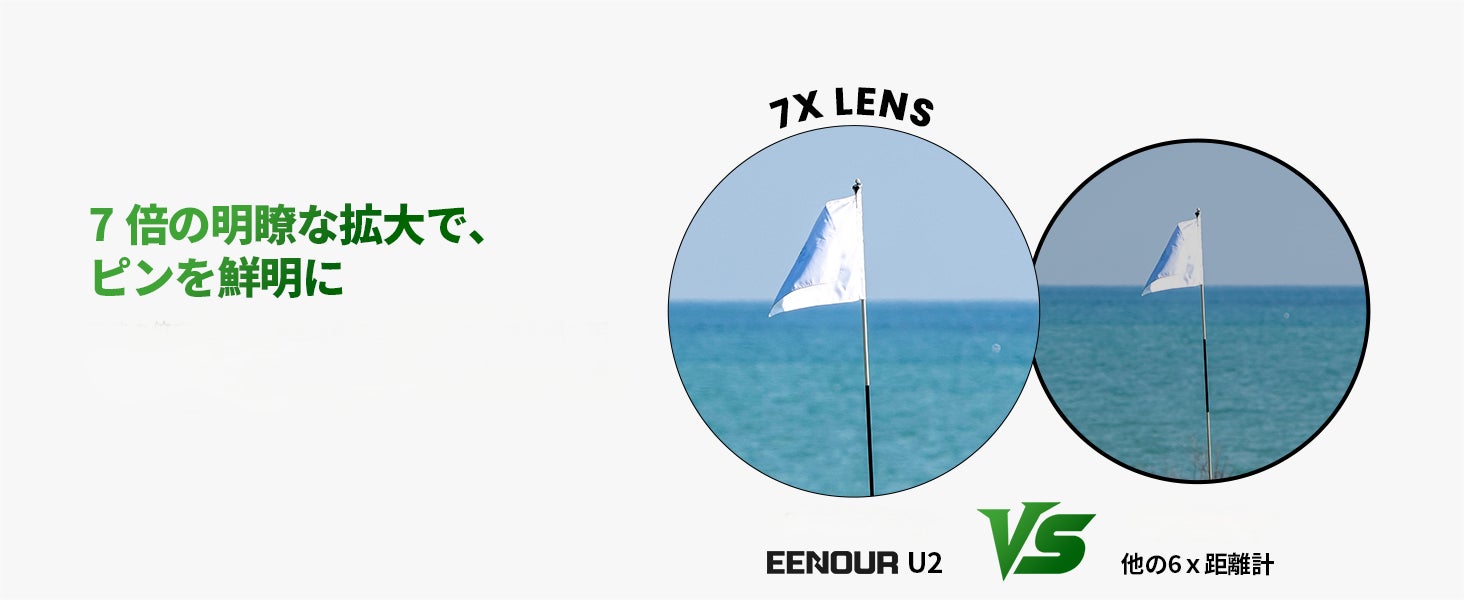 多くの距離計が6倍レンズを採用する中、「U1/U2」は7倍望遠レンズを搭載しており、遠くのピンやグリーンもはっきりと捉えることができます。これにより、視認性が向上し、目視による距離測定の誤差を軽減することが可能です。
