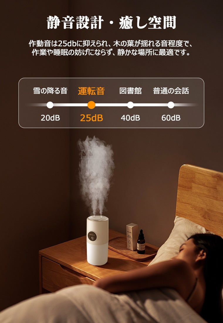 H7・H8加湿器は、運転音が非常に静かに設計されており、オフィスや自宅での仕事中や、夜間の睡眠を妨げません。昼夜を問わず快適な環境を提供し、集中力を保ちながら、リラックスできる空間を実現します。