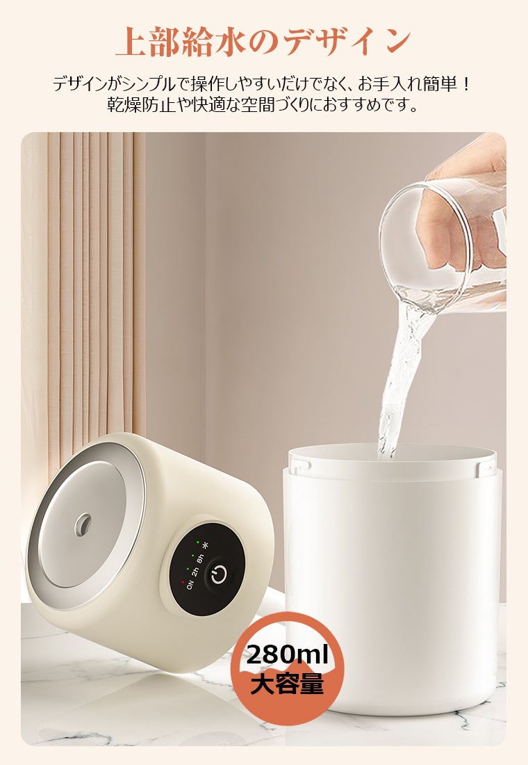 H7・H8加湿器は、280mlの大容量水タンクを採用し、上部給水型で簡単に水を補充できます。長時間の使用が可能で、頻繁な給水の手間がかからず、利便性と快適さを両立しています。