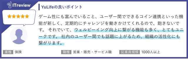YuLifeアプリは、従業員の定着率UP・満足度や生産性の向上を実現する、オールインワンの福利厚生・健康経営アプリです。ゲーム感覚で楽しめる健康促進プログラムや、日々の活動に応じて魅力的な商品・サービスとポイントを交換できるリワード(報酬)制度などを通じて、従業員の健康的な行動を促進・コミュニケーション活性化など健康経営やウェルビーイング経営をサポートします。顧客満足度5点満点中4.5点といった高い評価を継続的に得ており、ユーザーの皆さまからは以下のような評価をいただいております。