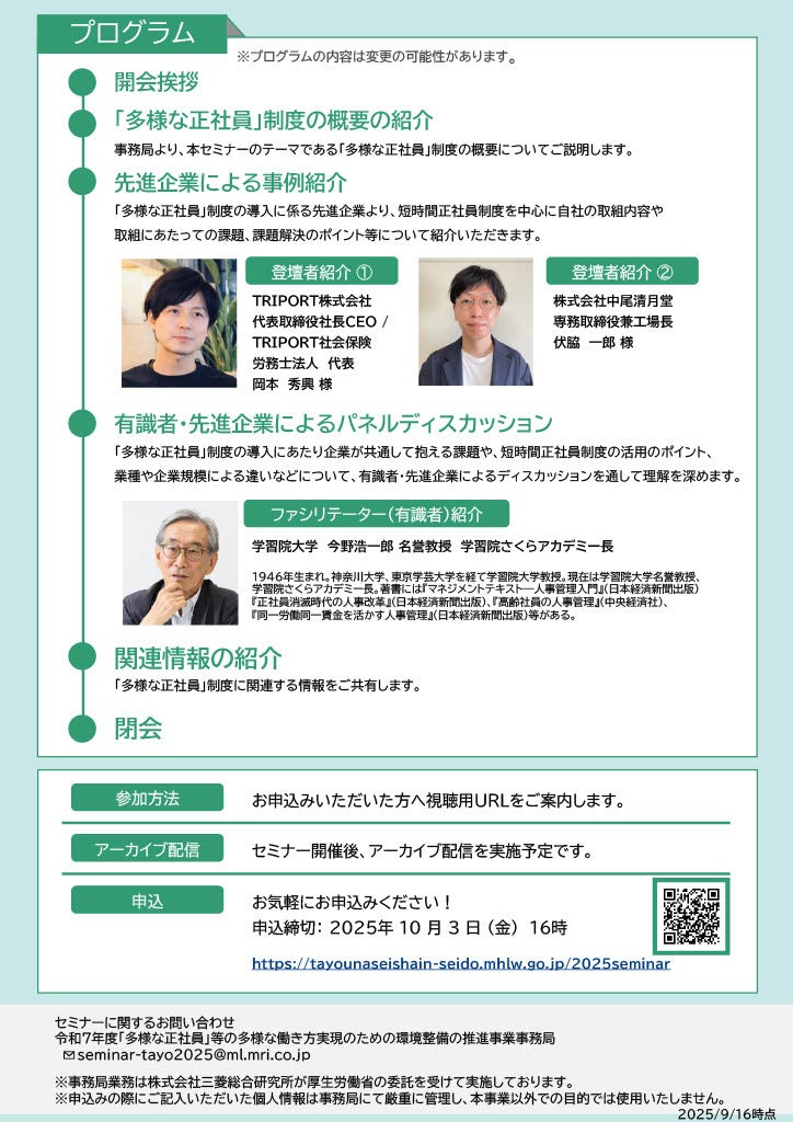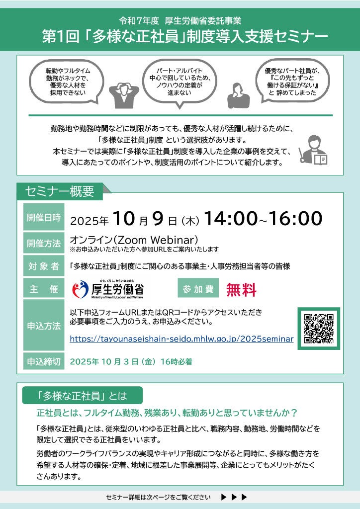 株式会社三菱総合研究所は、厚生労働省委託事業「令和7年度『多様な正社員』等の多様な働き方の実現のための環境整備の推進事業」の一環として、第1回「多様な正社員」制度導入支援セミナー(オンライン)を開催します。