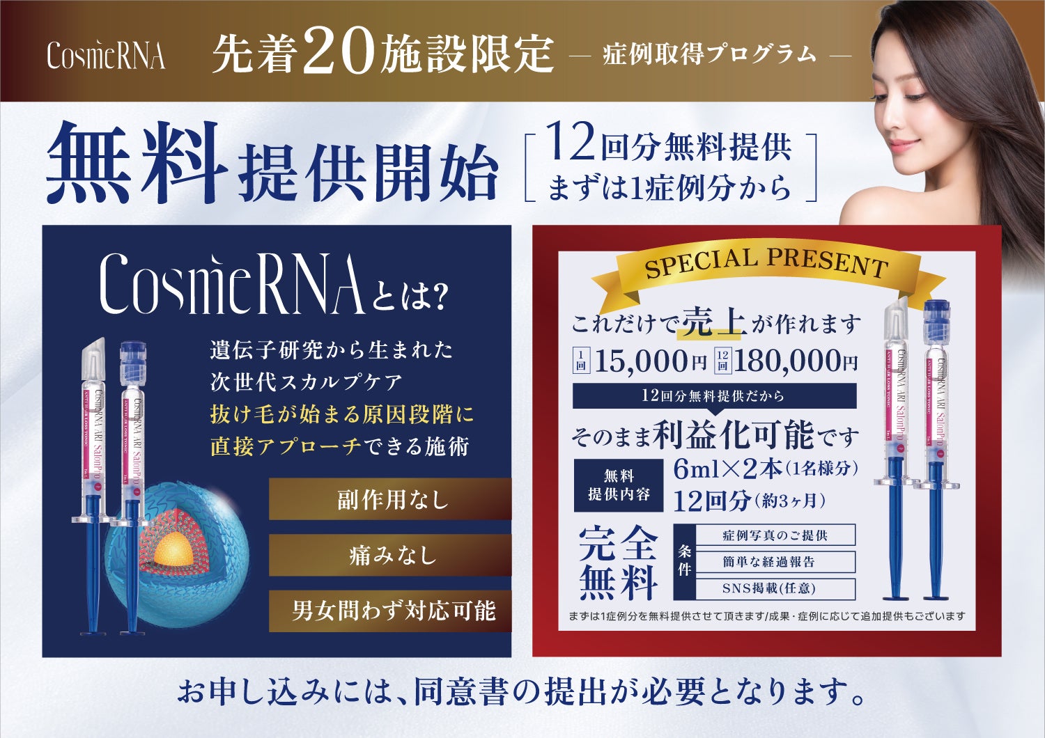 美容サロン・ヘッドスパ向けに無料サンプル提供・症例取得・収益化を支援する導入プログラムを開始。世界初※siRNAスカルプケア「CosmeRNA」で新たな売上機会を創出。