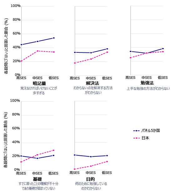 世帯年収などといったSES(家庭の社会経済的背景)と比較したところ、日本以外ではSES層による差は小さく、計算力層別の差よりも小さい傾向にありました。一方の日本ではSESが低いほど課題を感じている傾向にありました。日本では家庭環境による影響も計算力向上の課題であり、低SES層に対して積極的な学習支援の提供が必要である可能性が示されました。