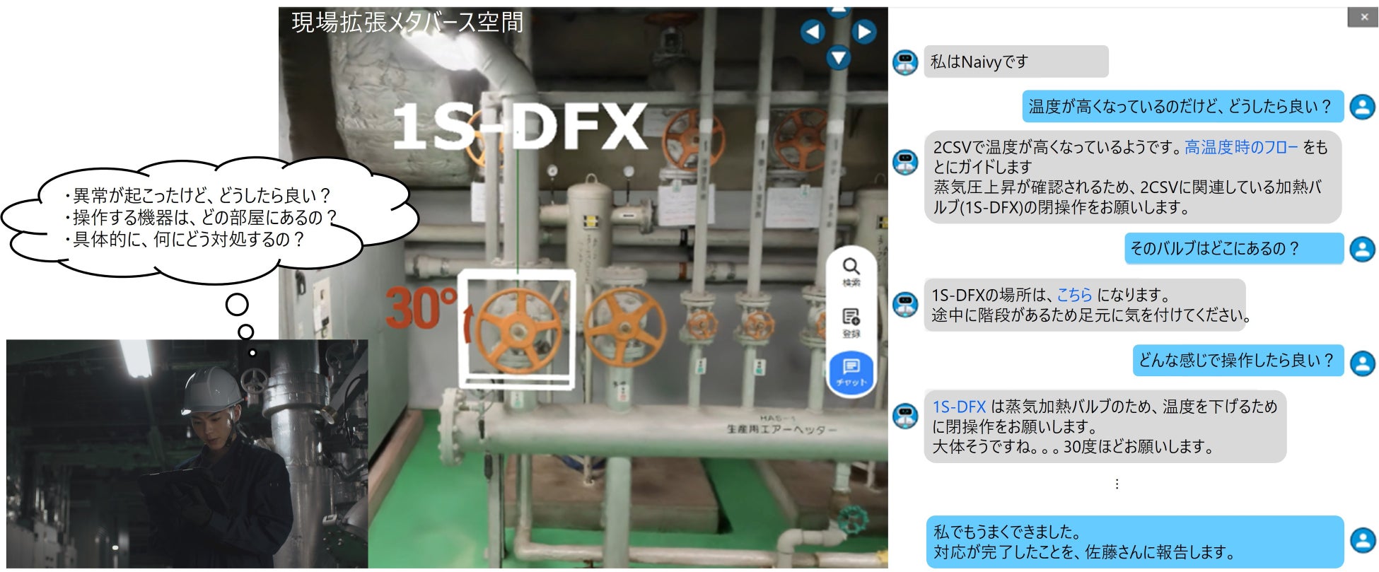 Naivyは現場拡張メタバースと連携し、非熟練者が現場で直面する課題に対して、位置情報や具体的な作業手順をメタバース空間上でリアルタイムに可視化します。例えば、空調管理のトラブルシューティングでは、装置名や部屋名から対象機器と位置を特定し、関連するワークフローを抜き出して操作方法を提示します。これにより、対象機器の特定や対処操作に迷うといった非熟練者のつまずきを軽減し、非熟練者でも熟練者のように自信を持って効率よく業務を遂行できる環境を構築します。