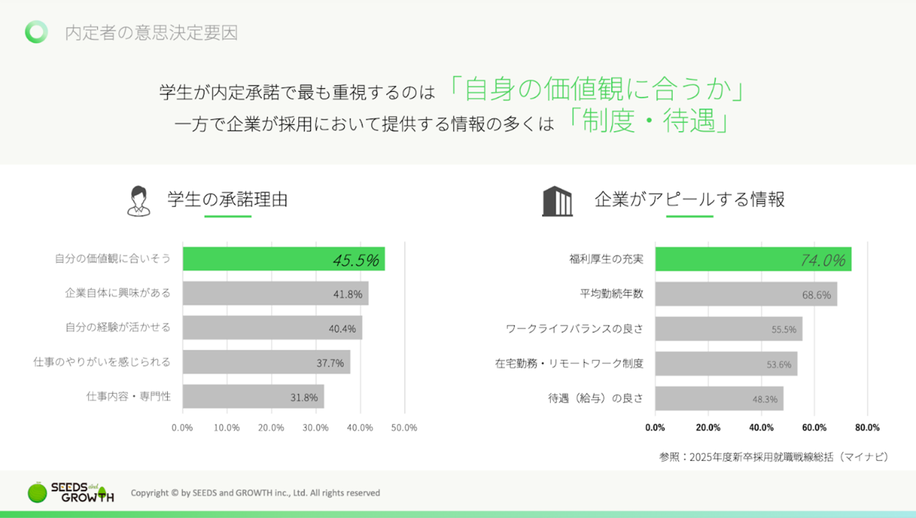 マイナビの調査(※1)によると、内定辞退理由の第1位は「仕事内容・キャリアビジョンの不一致」。一方、学生が内定承諾で最も重視するのは「自身の価値観に合うか」(45.5%)です。