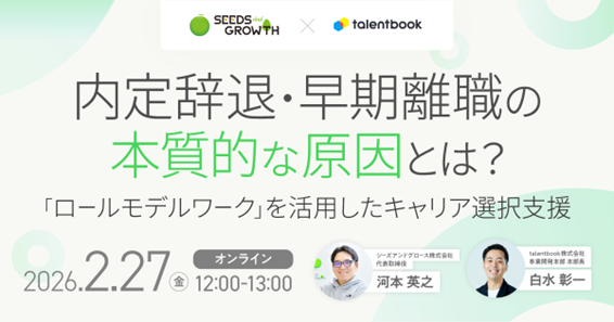 新卒採用に特化したコンサルティング会社 シーズアンドグロース株式会社((本社:東京都中央区、代表取締役:河本英之)と、ロールモデル就活・転職サイト「talentbook」及び、法人向け採用CXソリューションを提供するtalentbook株式会社(本社:東京都渋谷区、共同代表取締役:大堀航/大堀海、以下「当社」)は、新しい内定者フォロープログラム「ロールモデルワーク」の提供を開始いたします。