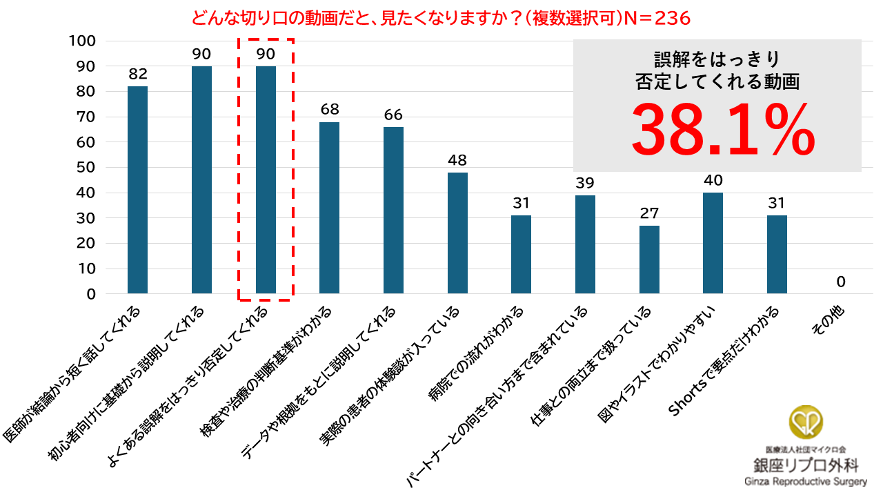 また、「どんな切り口の動画だと、見たくなりますか」という質問では、「初心者向けに基礎から説明してくれる」38.1%(90人)、「よくある誤解をはっきり否定してくれる」38.1%(90人)、「医師が結論から短く話してくれる」34.7%(82人)、「検査や治療の判断基準がわかる」28.8%(68人)、「データや根拠をもとに説明してくれる」28.0%(66人)が上位となりました。