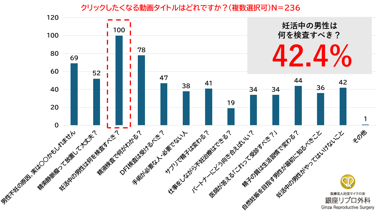 「次のうち、クリックしたくなる動画タイトルはどれですか」と尋ねたところ、最も多かったのは「妊活中の男性は何を検査すべき?」42.4%(100人)でした。次いで、「精液検査で何がわかる?」33.1%(78人)、「男性不妊の原因、実は○○かもしれません」29.2%(69人)、「精索静脈瘤って放置して大丈夫?」22.0%(52人)、「DFI検査は受けるべき?」19.9%(47人)となりました。