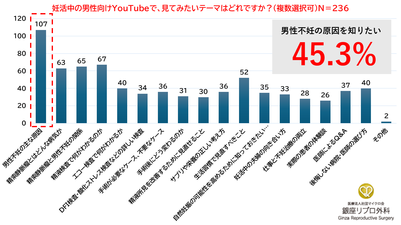 銀座リプロ外科は今回、妊活中または妊活予定の男性236人を対象に、男性不妊に関するYouTube動画について、どのような内容に関心があるのかを調査しました。まず、「妊活中の男性向けYouTubeで、見てみたいテーマはどれですか」と尋ねたところ、最も多かったのは「男性不妊の主な原因」45.3%(107人)でした。次いで、「精液検査で何がわかるのか」28.4%(67人)、「精索静脈瘤と男性不妊の関係」27.5%(65人)、「精索静脈瘤とはどんな病気か」26.7%(63人)、「生活習慣で見直すべきこと」22.0%(52人)という結果でした。