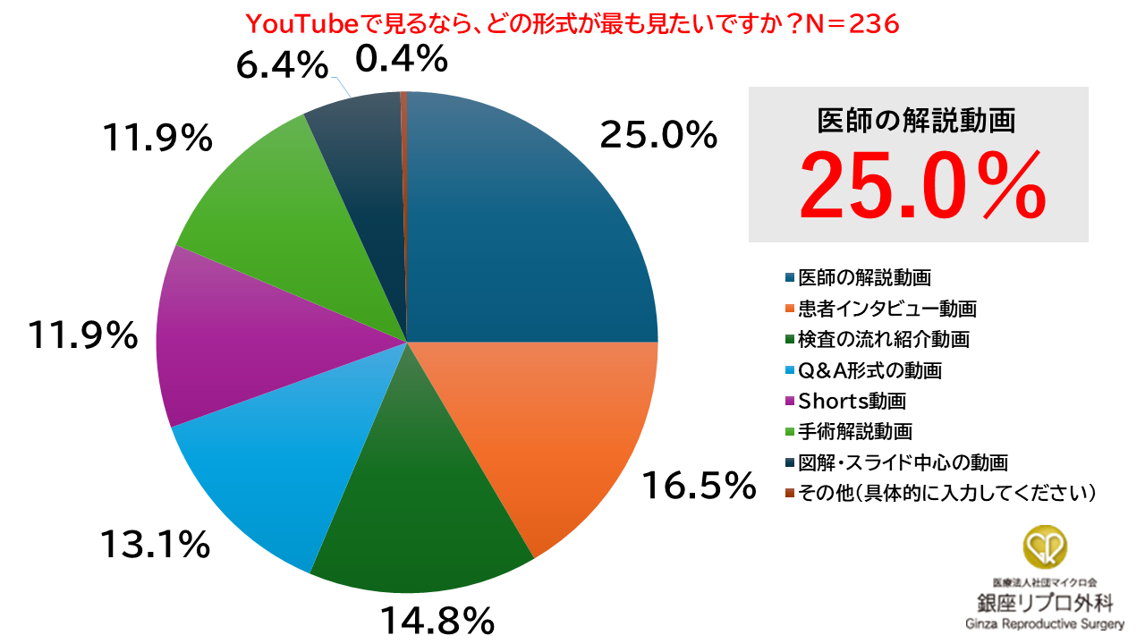 今回の調査では、「どんな形式の動画が見たいですか」という質問に対し、「医師の解説動画」25.0%(59人)が最多となり、「患者インタビュー動画」16.5%(39人)、「検査の流れ紹介動画」14.8%(35人)、「Q&A形式の動画」13.1%(31人)が続きました。