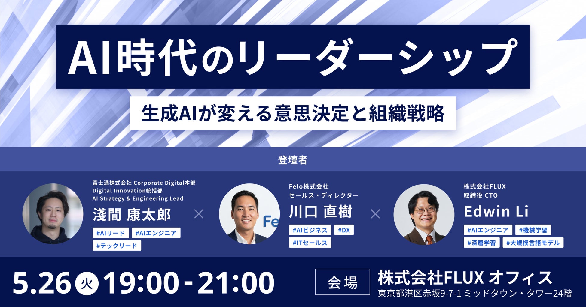 AI検索・生成AIプラットフォーム「Felo(フェロー)」を提供するFelo株式会社(本社:東京都千代田区、以下Felo)は、AIトランスフォーメーション支援を手掛ける株式会社FLUX(本社:東京都港区、以下FLUX)と共同で、経営層・マネージャー向けのビジネスセミナーを2026年5月26日(火)に、株式会社FLUXのオフィスにてリアル開催いたします。