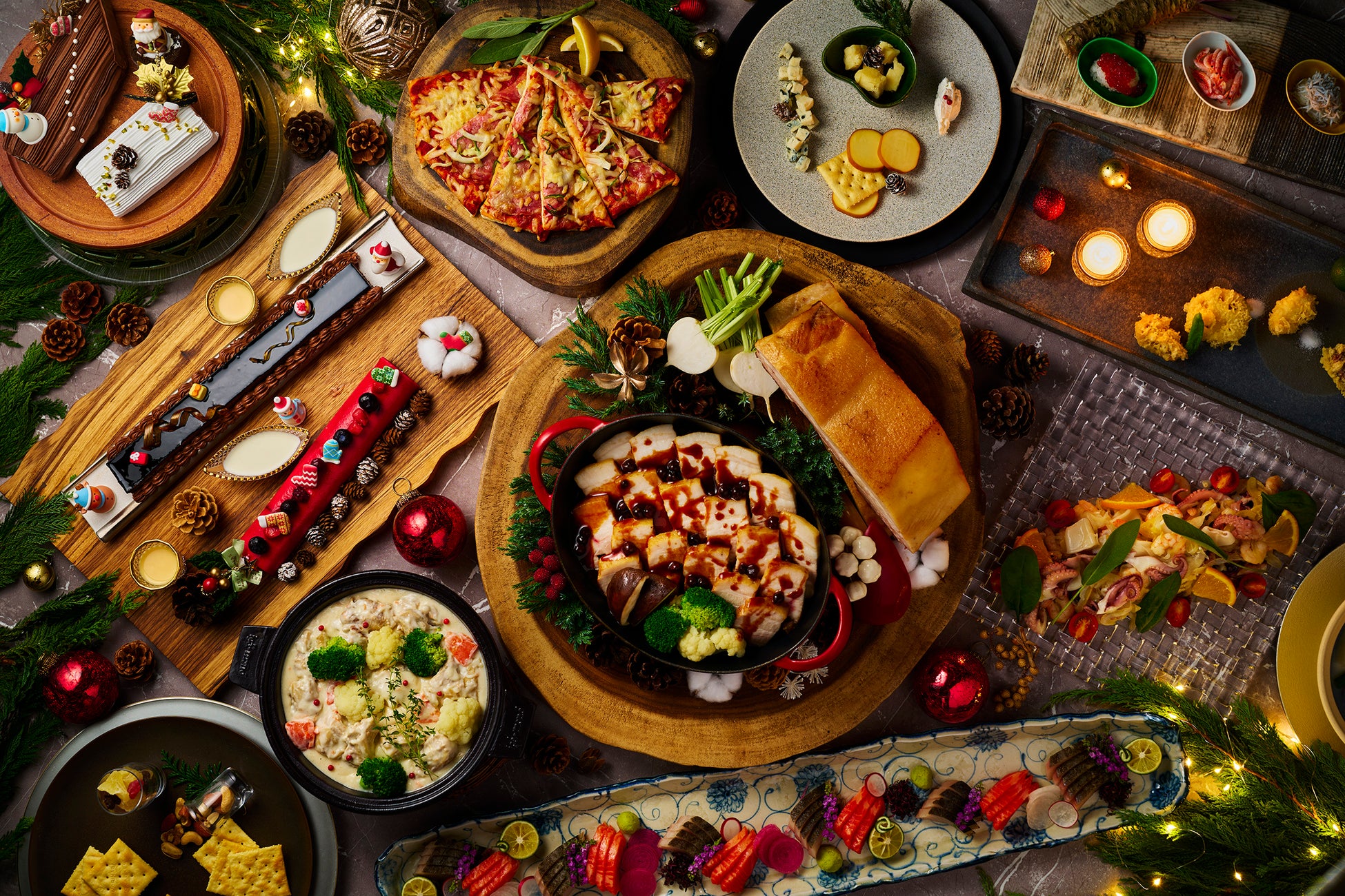 クリスマスケーキやローストポークなど、見た目も味も楽しめる華やかなビュッフェに加え、12月1日~12月25日限定で、クリスマスの定番、ロティサリーチキンも別注料理として登場。じっくり焼き上げ、ジューシーで柔らかく仕上げたチキンと、その香ばしい香りが、クリスマスの食卓を一層特別なものに彩ります。ビュッフェ料理に併せてご注文いただけます。